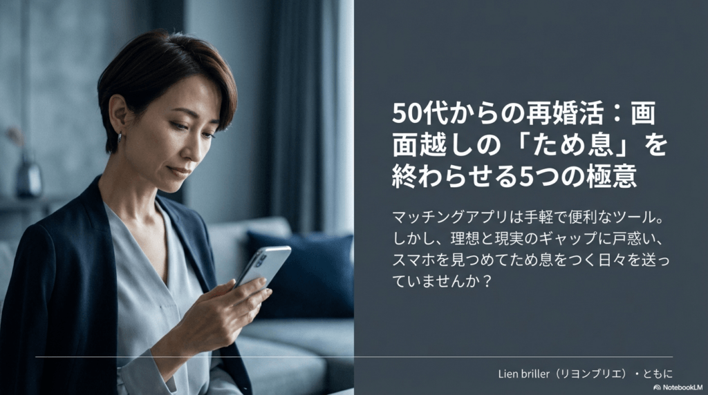 「40〜60代でマッチングアプリ!?」と思われる方もいるかもしれませんが、この年代ならではの戦術があります。代表の髙橋自身、離婚を経験し、40代、50代での婚活に苦しみました。マッチングアプリだけでなく結婚相談所も活用しましたが、最終的には「マッチングアプリ」で現在の妻と出会うことができました。こう聞くと「結婚相談所はあまり役に立たなかったのでは?」と思われるかもしれませんが、決してそうではありません。結婚相談所には本当に素晴らしい仕組みがあり、活用次第で大きな力になります。だからこそ『Lien briller・ともに』では、40代以降の皆さんが「マッチングアプリ」と「結婚相談所」、2つの選択肢から自分に合った方法を選べるようサポートしたいと考えています。