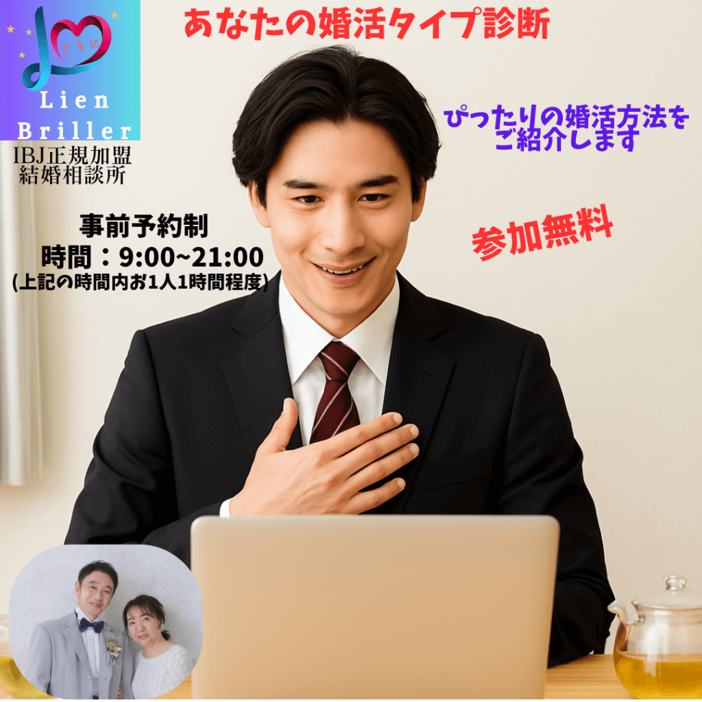 弊社結婚相談所では随時、オンラインで婚活タイプ診断を実施しています。あなたの今までの婚活状況やお相手の希望条件などを詳しくお聞きして、あなたに合ったより良い婚活方法をご提案させて頂きます。